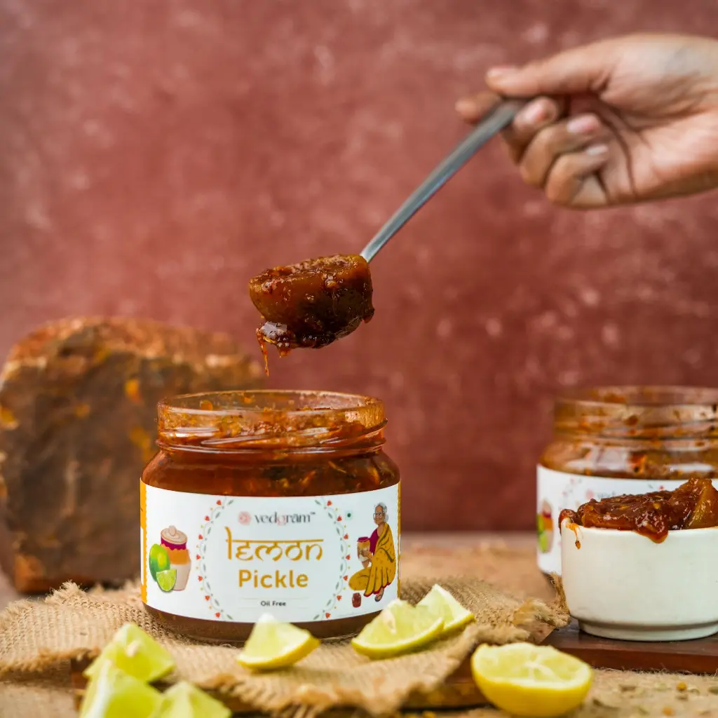 Enjoy the perfect balance of tangy-sweet flavors with Vedgram’s Oil-Free Lemon Pickle, made from handpicked, sun-cured lemons and a special blend of traditional spices—without a drop of oil! Crafted using age-old recipes, this pickle brings you all the deliciousness of homemade pickles in a healthier, lighter way.